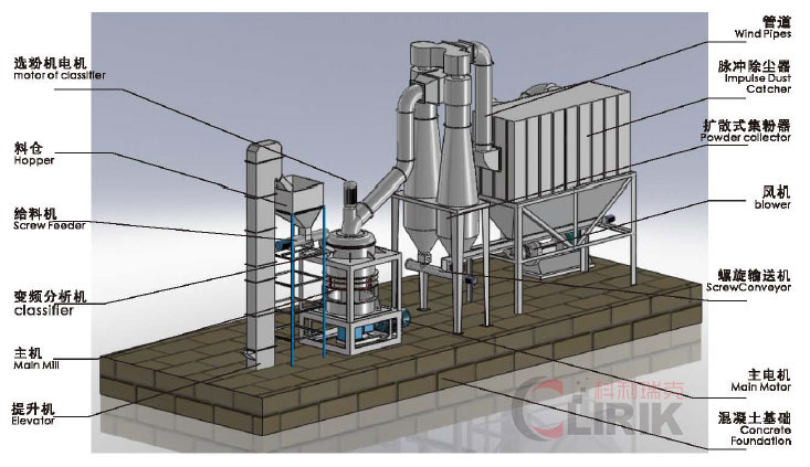 超細磨粉機生產線通常有錘式破碎機、斗式提升機、儲料倉、震動給料機、微粉磨主機、變頻分級機、雙聯旋風集粉器、脈沖除塵系統、高壓風機、空氣壓縮機、電器控制系統等組成。大塊物料經錘式破碎機破碎成適合超細磨粉機工作的進料粒度(20mm左右),然后通過調節磨粉機分析機的轉速,達到適合生產要求的細度,經過人工包裝成袋,也可以根據需要配置自動微粉打包機及選用不同型號的磨粉機。