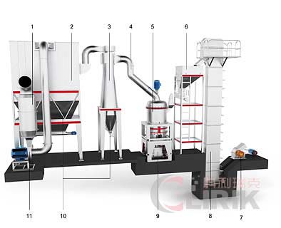 HGM云母磨粉機(超細磨粉機)全套配置包括錘式破碎機、斗式提升機、儲料倉、震動給料機、微粉磨主機、變頻分級機、雙聯(lián)旋風集粉器、脈沖除塵系統(tǒng)、高壓風機、空氣壓縮機、電器控制系統(tǒng)。
